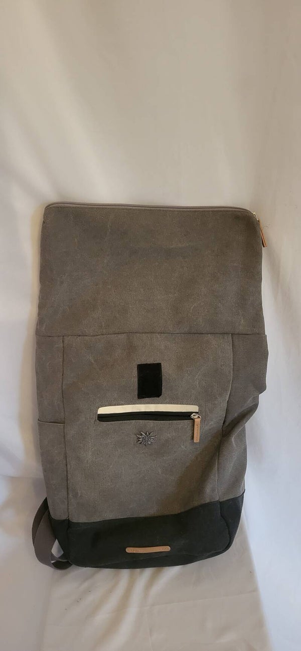 Praktischer Rolltop-Rucksack in Grau/Schwarz mit hübschem Edelweiss-Emblem. Viel Stauraum, gepolsterter Rücken, Aussenfach mit Reissverschluss und verstellbare Träger. Perfekt für Alltag, Arbeit, Uni oder Ausflüge.