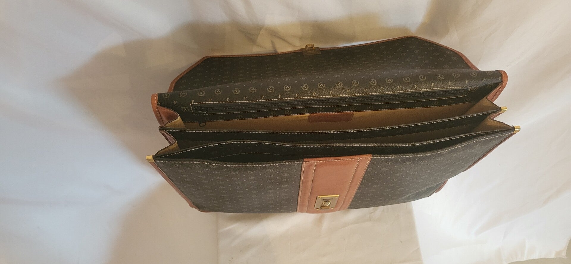 Elegante Pollini-Aktentasche mit typischem Logo-Muster und Lederdetails. Mehrere grosse Innenfächer, Reissverschlussfach, stabiler Griff und Zahlenschloss vorne. Perfekt für Büro, Schule oder stilvolle Ordnung zu Hause.